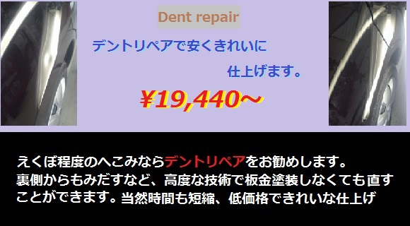 など車両保険を使うにはもったいない程度の修理には ・部分的に修理する「軽補修」(\16,200~)や、 ・塗装しないでヘコミを直す「デントリペア」(\19,440~) などで安く修理できる場合もありますので、お気軽にご相談ください。 ・不意にぶつけてしまった、 ・不意にぶつけてしまった場合でも、いろいろな修理の仕方があって安く直せる場合も多々ありますのでお気軽にご相談ください。 *メールでのご相談はこちら